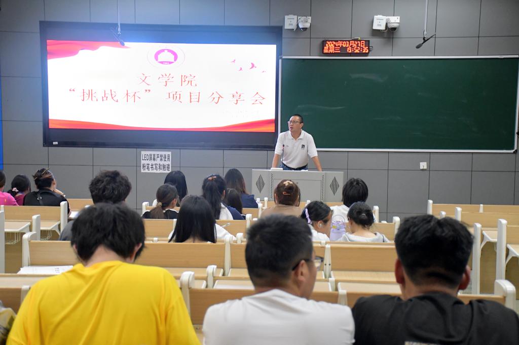 大会伊始,张杰为同学们讲解了挑战杯的重要意义,并希望大家能够以挑战杯为平台展现团队的创新思维能力和分工协作能力。他以“三线建设”为例,着重强调了创新与实践结合的重要性,指出本次分享会PPT的核心内容,激励同学们大胆创新,培养创新思维和创业精神。八名参赛者依次上台介绍挑战杯负责项目,结合时代背景、当下政策以及市场需求分析了项目的发展前景与独特优势,根据实地考察、采访调查等方式考究自身项目的可行性,各团队成员分工明确,各司其职。最后,王春梅总结大会,对本次“挑战杯”项目主题给予肯定,对勇于创新、敢于挑战的同学们提出表扬。