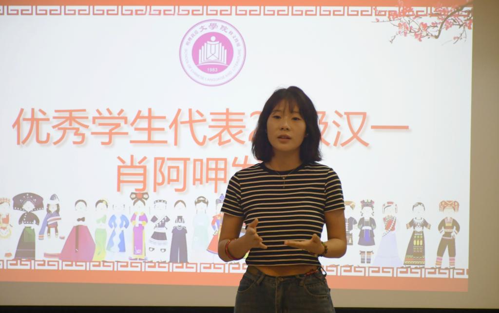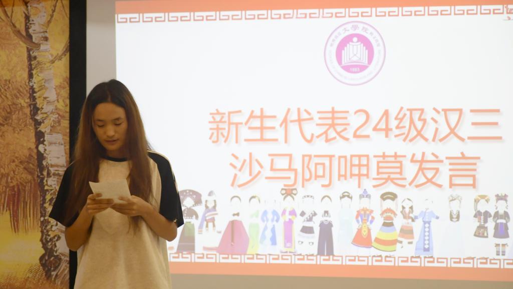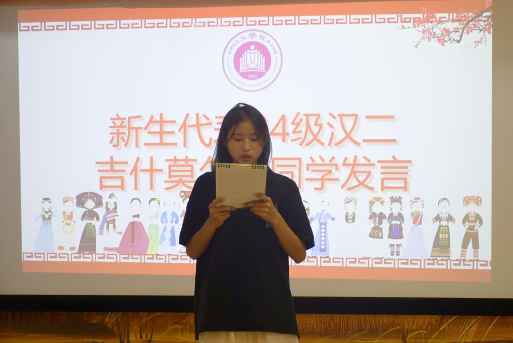 2024级少数民族学生代表吉什莫尔歪、沙马阿呷莫进行发言,表示部分少数民族学生在普通话交流、学习适应等方面存在一定困难,相信在大家的共同帮助下能够取得进步,同时呼吁同学们要弘扬民族团结精神,拒绝歧视与偏见。