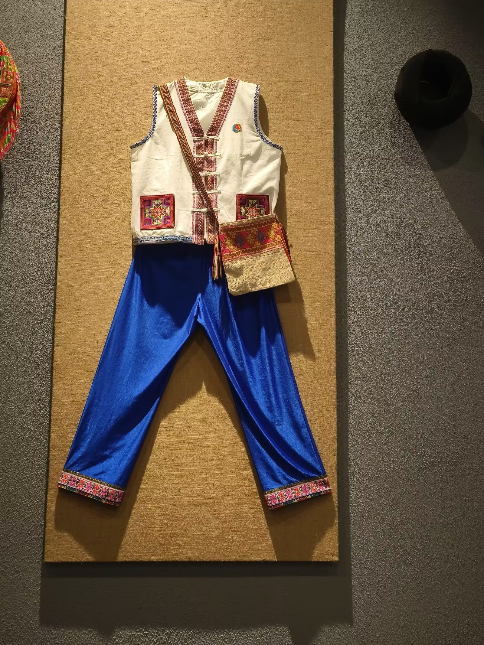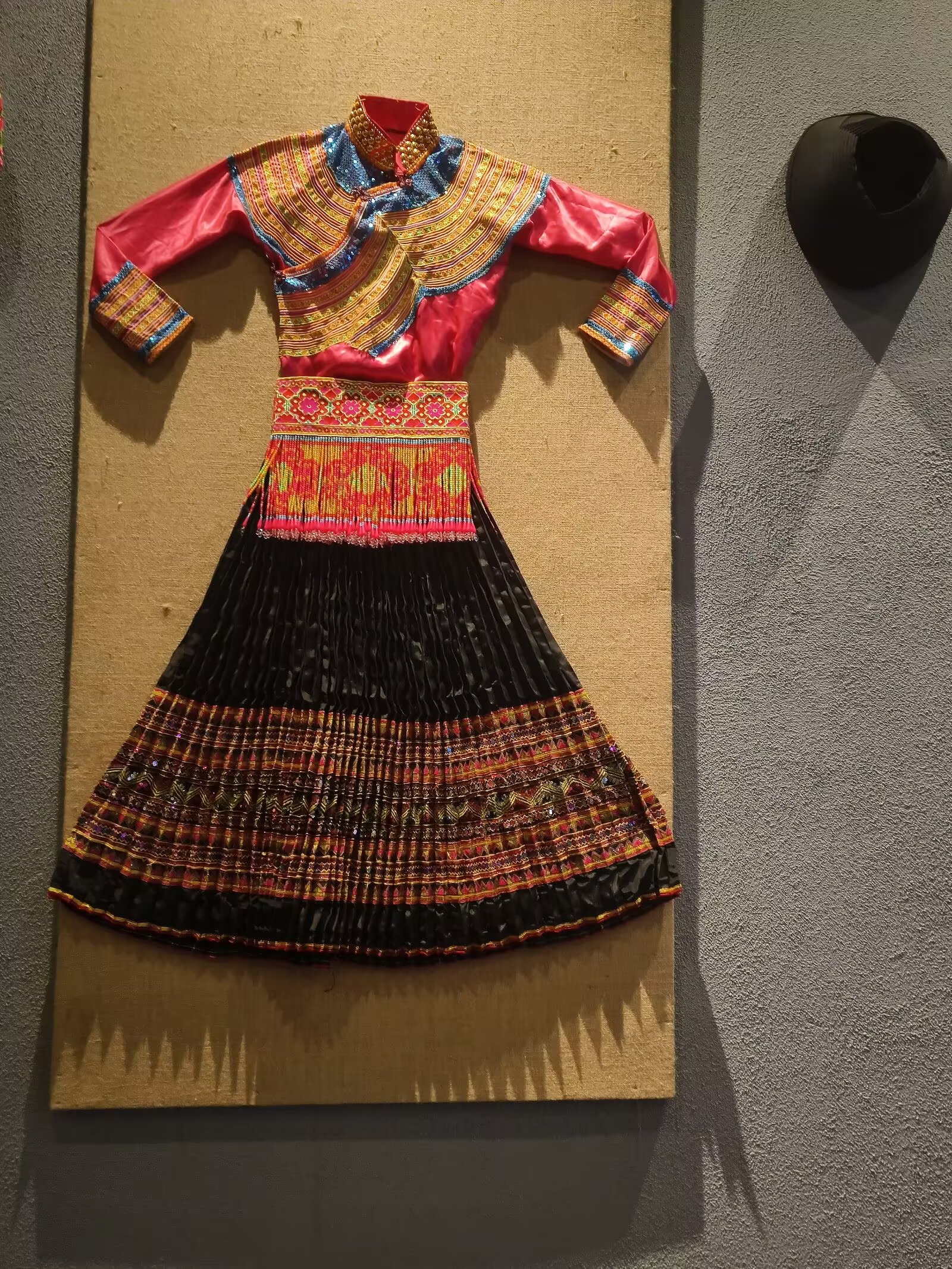 踏入新山傈僳族民俗博物馆,傈僳服饰如“活态文化史”铺展:男装以黑为底,马褂样式搭配蓝黑包头,利落中藏着山地劳作智慧;女装裙裾层叠,浓艳色彩间,几何纹与山水、太阳图腾交织,诉说对自然的敬畏与迁徙记忆。团队成员们驻足凝视粗麻面料的质朴、银饰的华丽。更在试穿体验中切身感受“服饰是民族文化载体”的深意——每道纹路、每件配饰,都藏着世代传承的故事。
