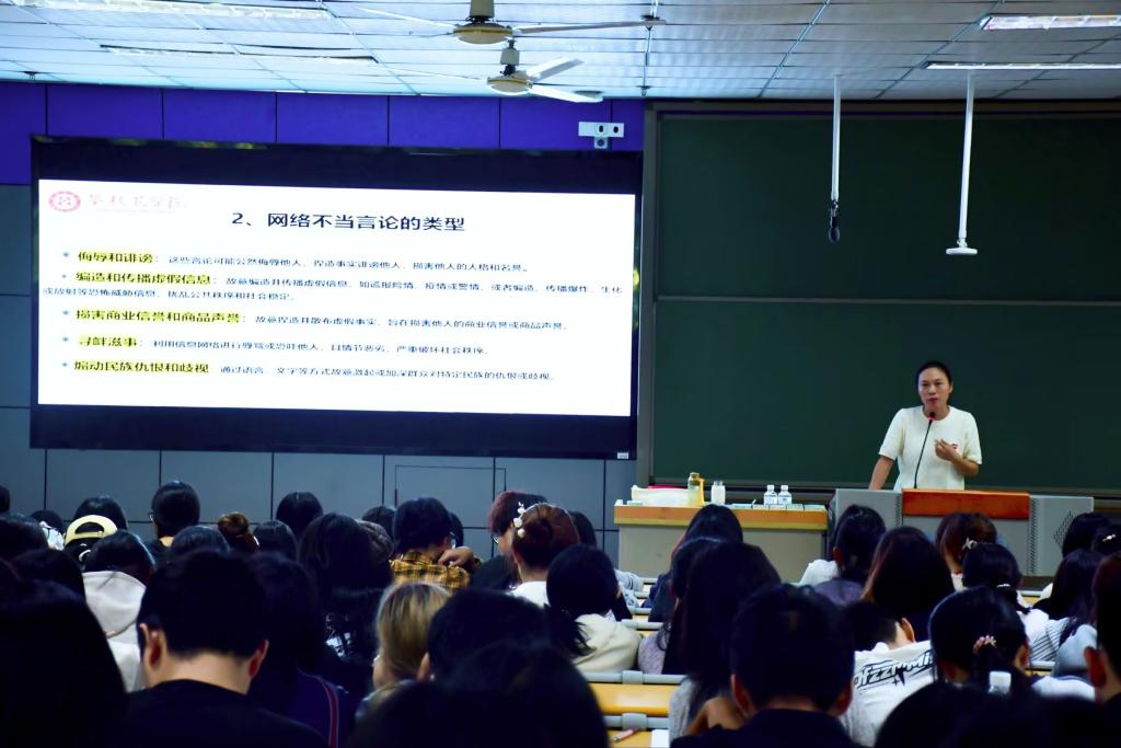 讲座伊始,王霞以近期某高校学生因网络不当言论触犯法律的案例为引,强调网络并非法外之地,虚拟空间中的言行同样受法律约束。随后,她从网络不当言论的定义、类型、特点以及危害入手,深入剖析了什么是网络的不当言论,以及对个人、校园、社会、国家和网络环境产生的不良影响,引领同学们认清网络言论涉及的核心法律领域与责任,并结合具体案件分析。最后,王霞提醒同学们要强化法律认知,秉持审慎原则,增强风险意识,切勿“按键”伤人,请“键”下守法。