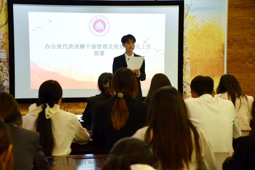 王雪梅就此次大会进行总结。她充分肯定了各位干部的优秀表现,希望能够继续保持,坚守为同学服务的初心,同时向大家介绍2025级新生“成长引航员”项目活动,要求高年级学生在学习、生活、未来规划等方面对新生有引导作用,以优带新,共同营造良好向上的学院氛围。