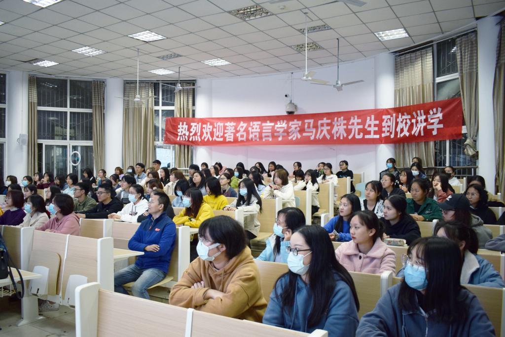 来校期间,马庆株教授为全校师生做了题为“略谈汉语语法学习和研究”和“爱普通话、爱规范汉字、爱汉语拼音”两场学术报告。