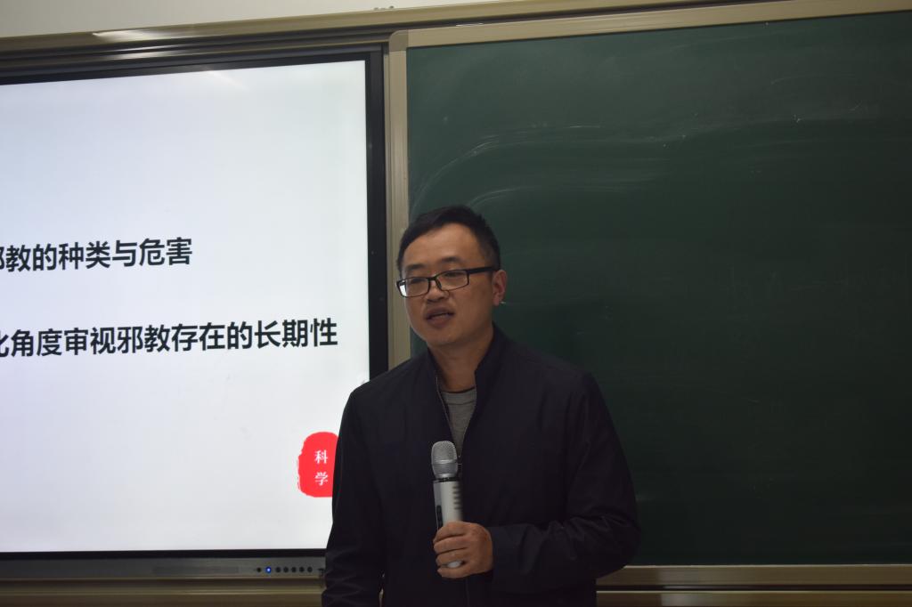 讲座中,张磊从“何为守护精神港湾”发问,从某邪教引入,为同学们解释了何为邪教。他从邪教溯源的角度指出,邪教的本质为宗教,但不是正统的宗教概念,而是社会法律概念,向同学们阐述了宗教的概念、宗教演变为邪教的过程以及邪教的特点。张磊介绍了许多国内外邪教的种类及危害,指导同学们从“信仰对象、标识、宣传品、聚会地点、活动方式、常用术语”六个方面去识别邪教。张磊从“宗教信仰的异化、封建迷信的遗毒、社会变迁、国际环境的影响”四个方面阐述邪教长期存在的原因;从国家层面的政策措施与个人民生教育方面阐述反邪教的具体措施与方法,构筑牢固的守护精神家园的盾牌。