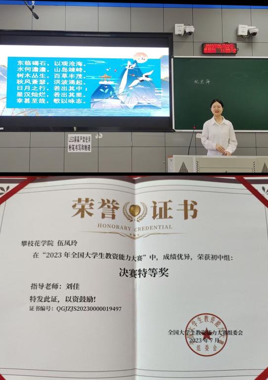 全国大学生教资能力比赛是由普通高等学校创新创业教育协作会和黑龙江省创新教育研究院主办的。此次大会决赛分为小学组、初中组和高中组,三大组别,吸引了复旦大学、同济大学、武汉大学、北京师范大学、四川大学等100多所高校学生参与。beat365官网20级汉语言文学专业伍凤玲同学在刘佳老师的指导下,从决赛812名考生中脱颖而出,荣获大赛初中组决赛特等奖。此外,21级秘书学专业肖莉元同学荣获初中组决赛一等奖,21级秘书学专业李红英、韩心月同学荣获小学组决赛三等奖,22级汉汉语言专业李欣洋同学荣获高中组决赛三等奖,21级汉语言文学专业李峄荟同学荣获小学组决赛优秀奖。此次比赛充分彰显了英国beat365官方网站入口英国beat365官方网站入口学生自身优良的学科素养和扎实的教学基本功,展现他们在讲台上专业与自信。